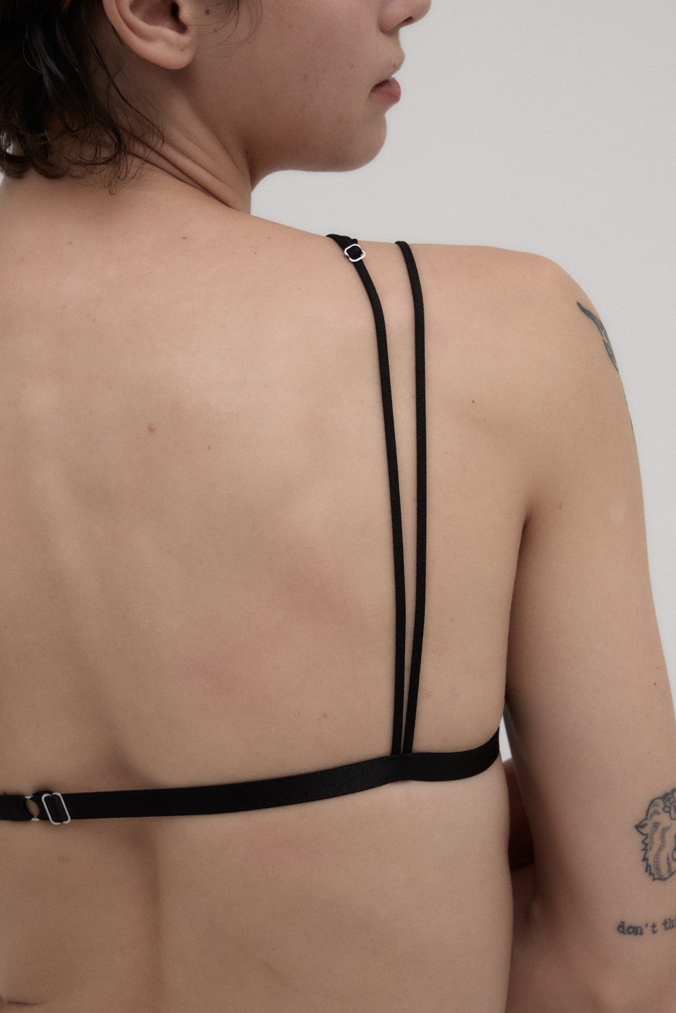スパゲティストラップとカップシルエットを描くパイピングテープのラインデザインがランジェリーをよりモードな印象に。