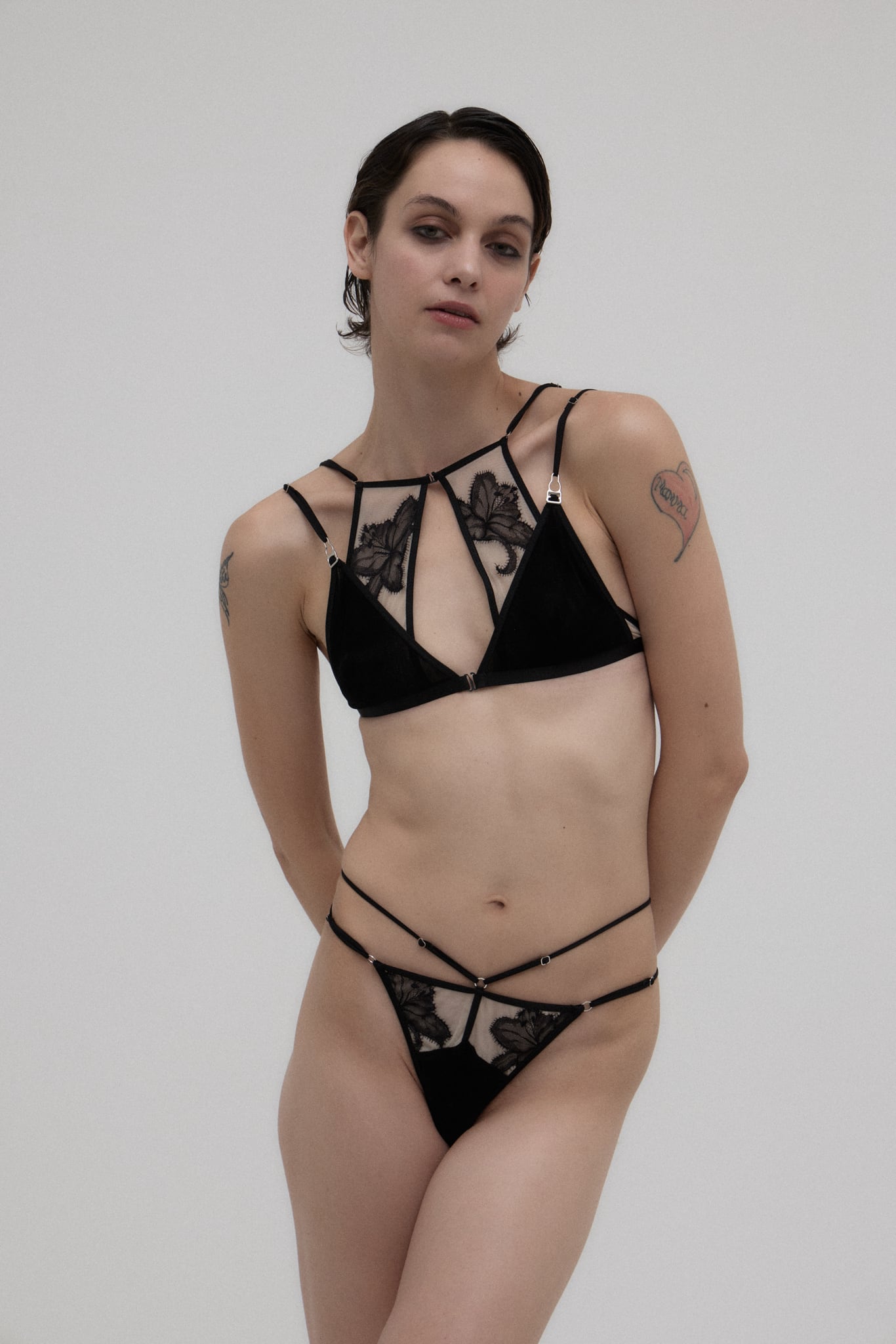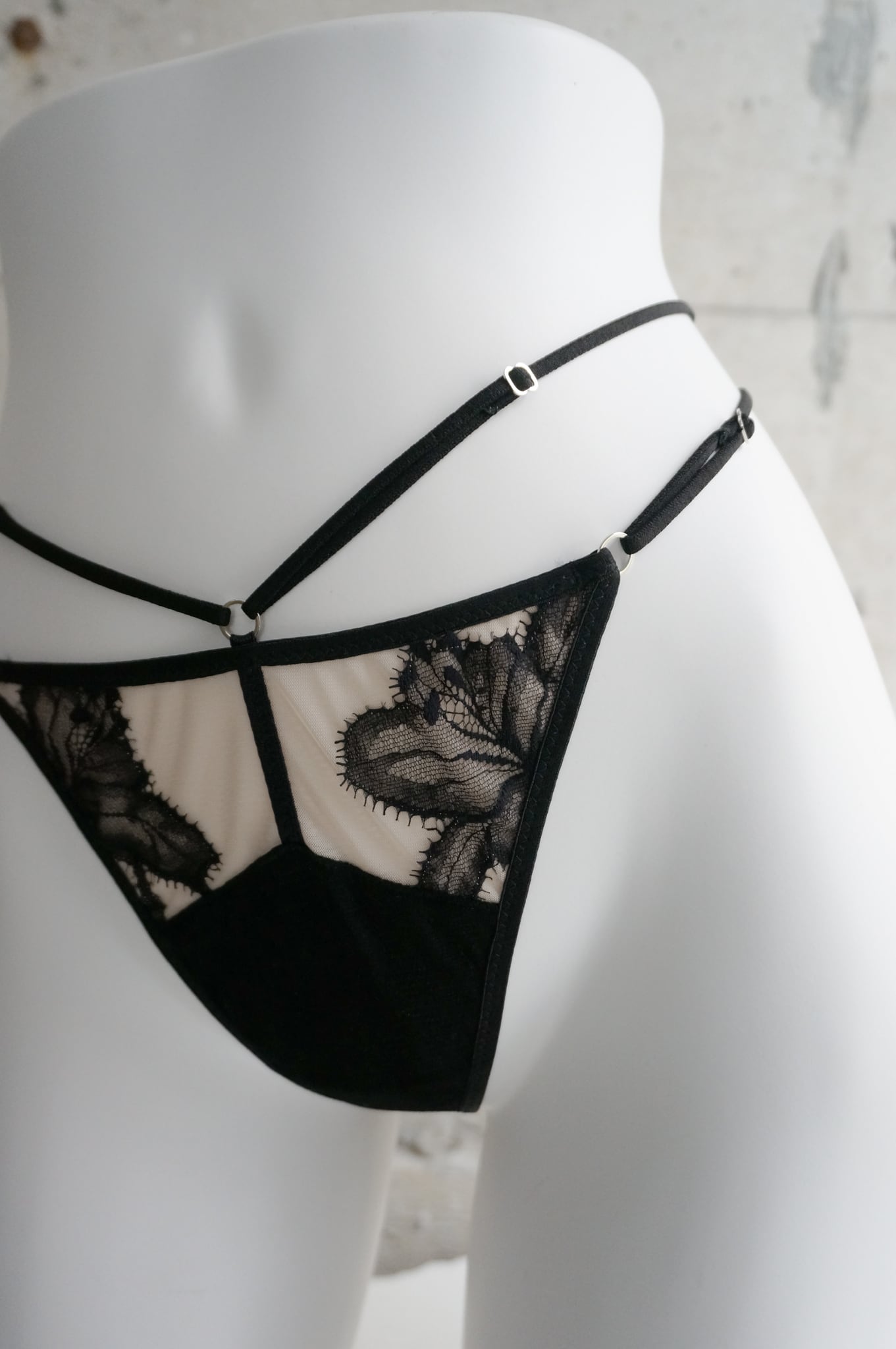 スパゲティストラップとヒップラインを描くパイピングテープのラインデザインがランジェリーをよりモードな印象に。
